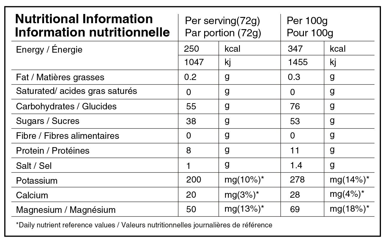 Μείγμα ροφήματος με φυτικές πρωτεΐνες (11%) και σάκχαρα (82%), με γεύση ροδάκινου-βερίκοκου (2%). Συστατικά: δεξτρόζη, μαλτοδεξτρίνη, απομονωμένη πρωτεΐνη canola, Palatinose™ (ισομαλτουλόζη)*, φυσική γεύση, θαλασσινό αλάτι, ρυθμιστής οξύτητας (κιτρικό οξύ), μέταλλα (κιτρικό κάλιο, κιτρικό μαγνήσιο), φυσικά χρώματα (εκχύλισμα φυτικού χυμού, βήτα καροτίνη).
